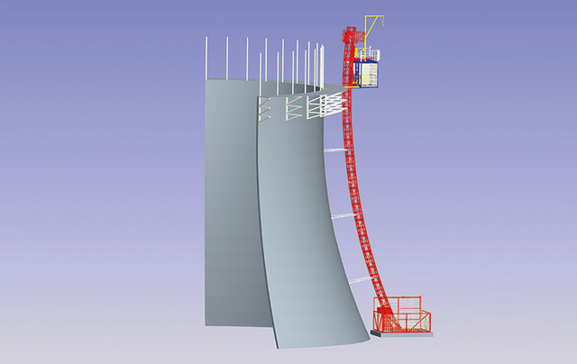 該機(jī)廣泛應(yīng)用于煙囪、冷卻塔、橋梁等建筑工程。升降機(jī)導(dǎo)軌架特殊處理,可曲線、斜線布置。采用浮動調(diào)平機(jī)構(gòu)保證升降機(jī)沿曲線、斜線運行時,吊籠始終保持水平。導(dǎo)軌架為直線時,該機(jī)也可作為直線升降機(jī)使用。