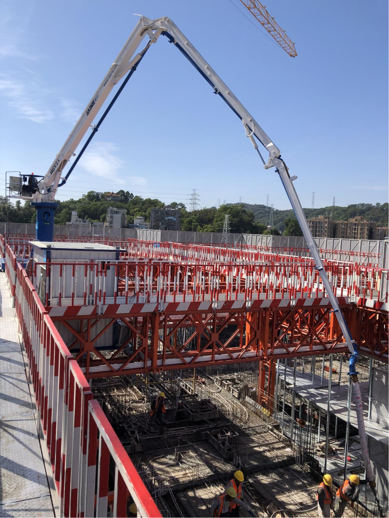 模架式液壓混凝土布料機自帶鋼平臺底座,與爬模架體連接傳遞施工載荷,無需自帶動力系統,爬模爬升時帶動其爬升。其中HGY21模架式液壓混凝土布料機于2021年11月成功應用在使用“住宅造樓機”的裝配式建筑領域(中建三局承建的廣州大源村項目)。
