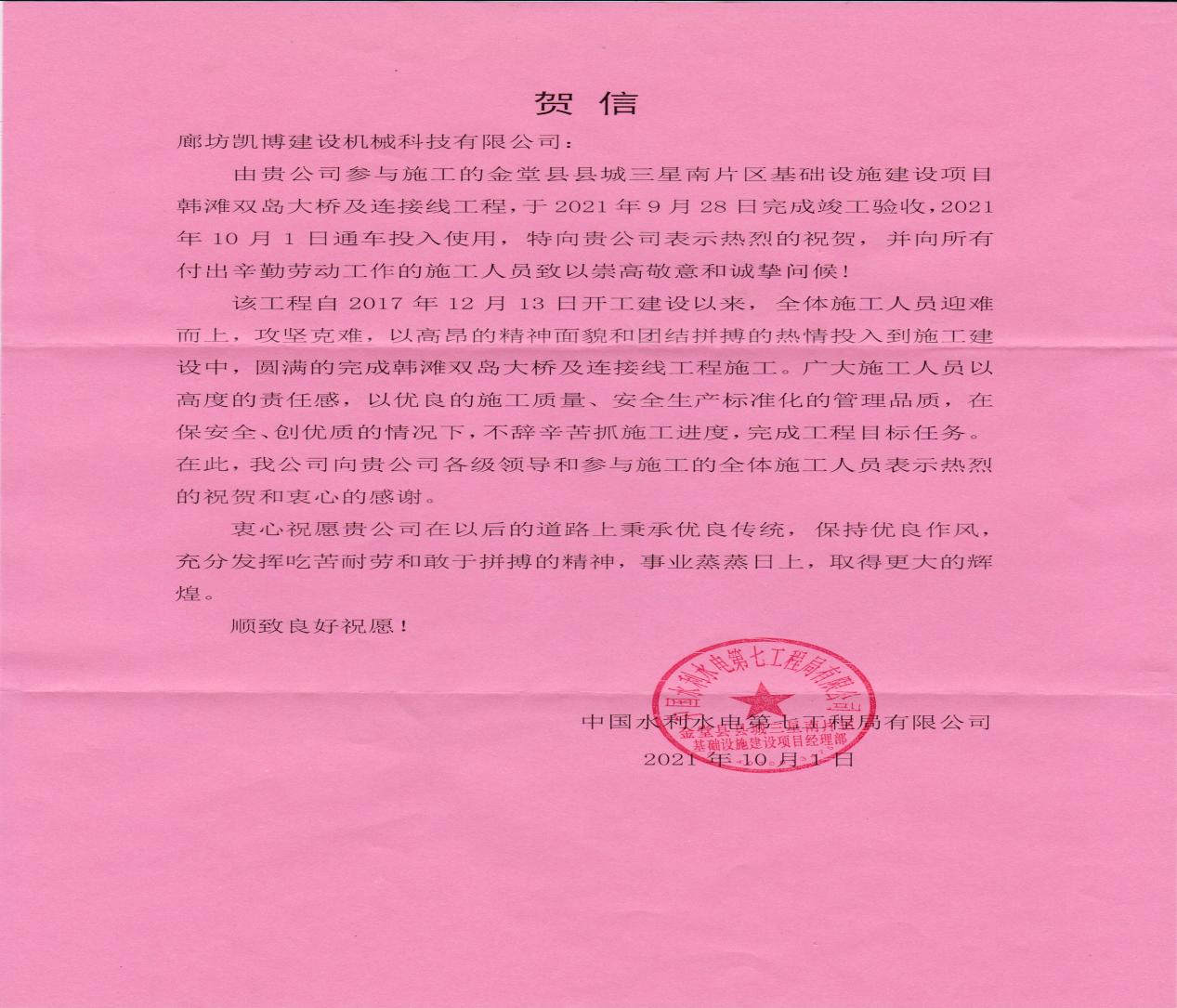 中國水電七局邀請我公司參加了金堂大橋的通車儀式、贈送紀念品,并專門發(fā)來賀信,對我公司在項目合作中的支持配合與辛勤付出表示衷心感謝。